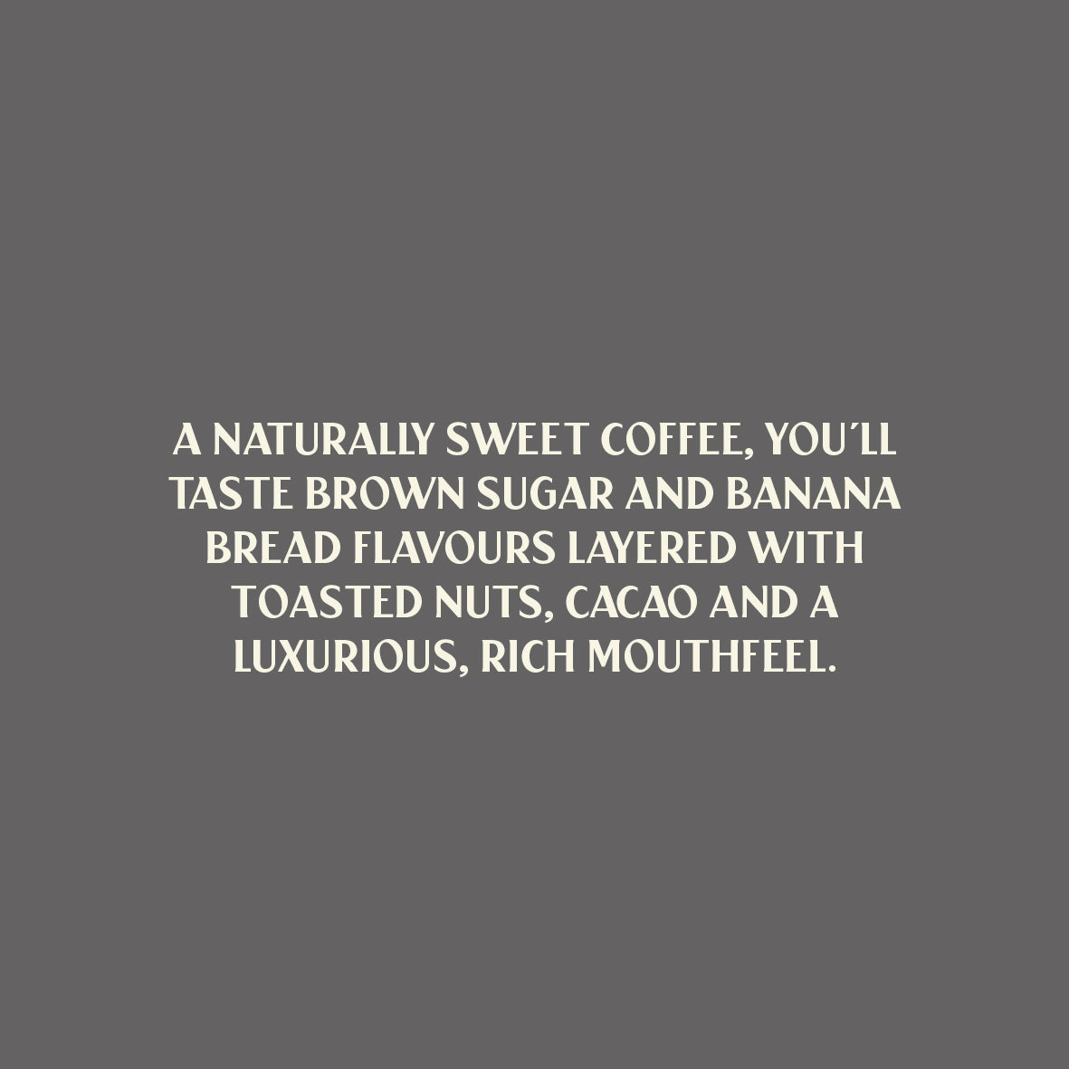 Tasting Notes: A naturally sweet coffee, you’ll taste brown sugar and banana bread flavours layered with toasted nuts, cacao and a luxurious, rich mouthfeel.
