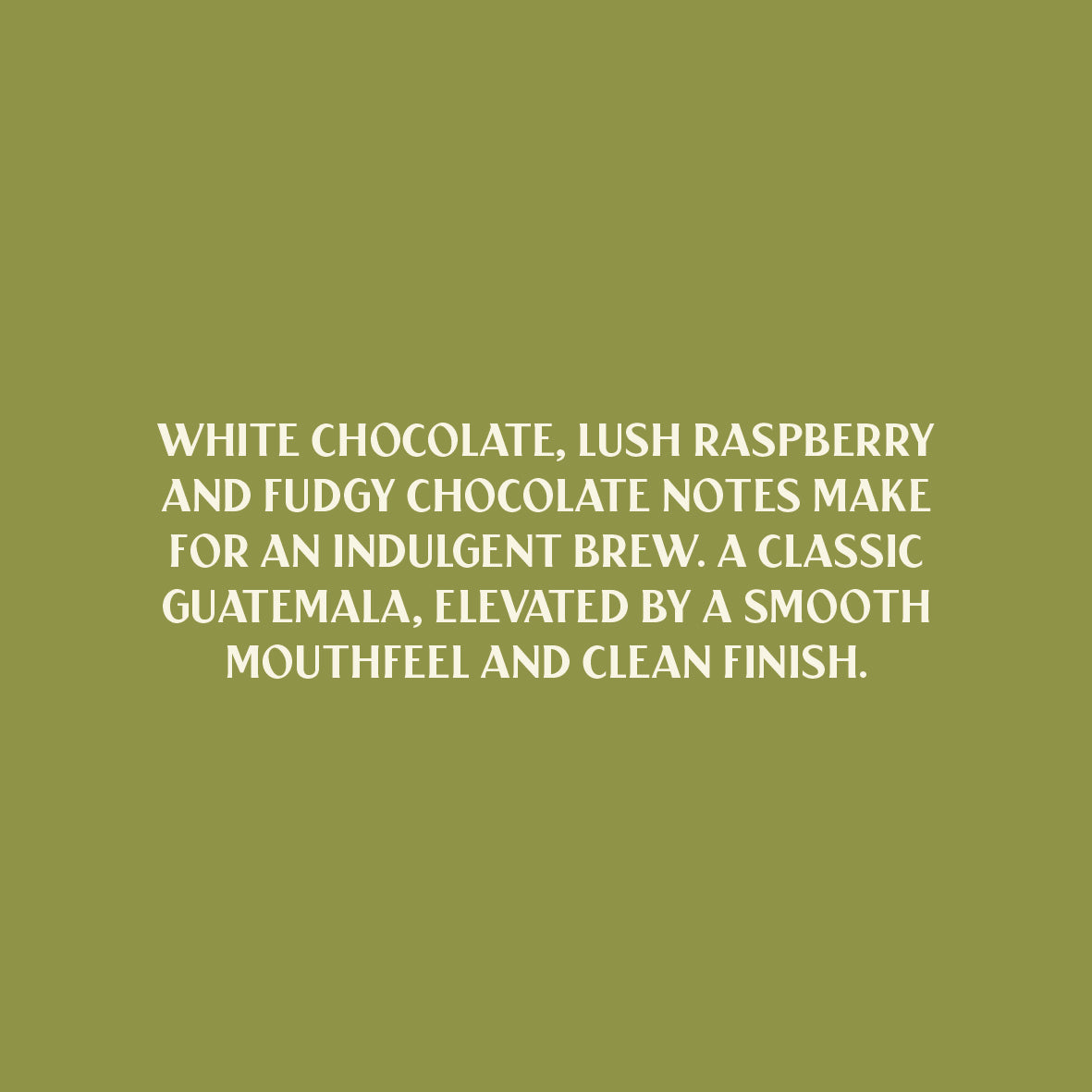 Tasting Notes: White chocolate, lush raspberry and fudgy chocolate notes make for an indulgent brew. A classic Guatemala, elevated by a smooth mouthfeel and clean finish.
